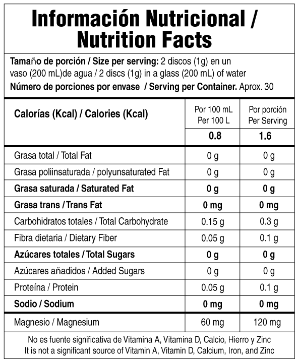 Cada porción diaria (2 discos preparados en 200 mL de agua) aporta 120 mg de magnesio.